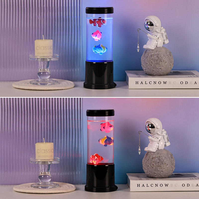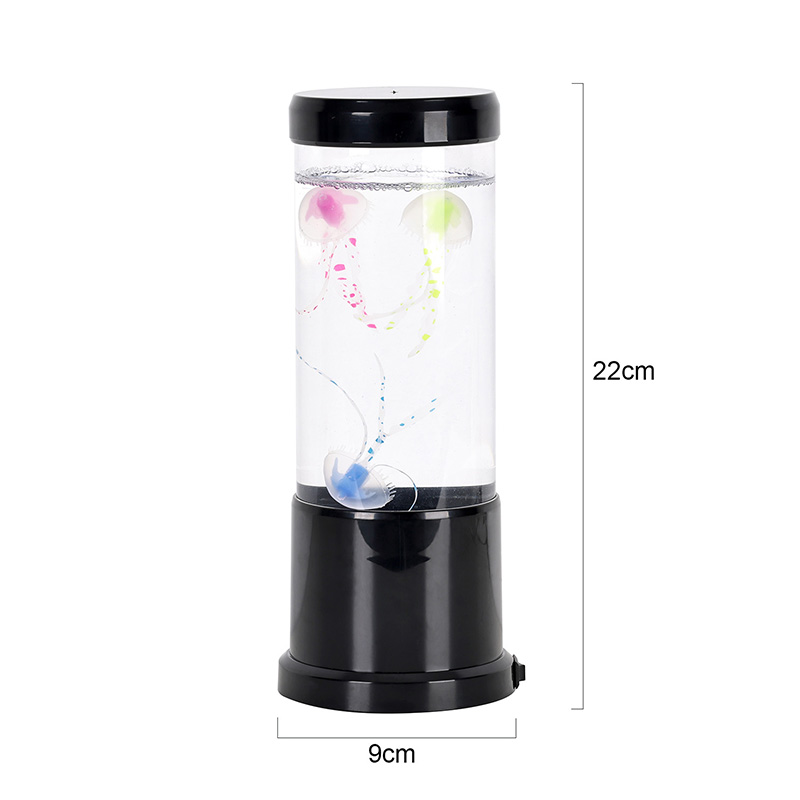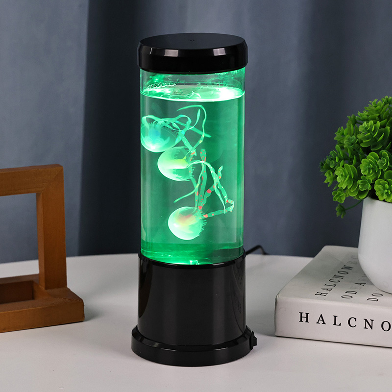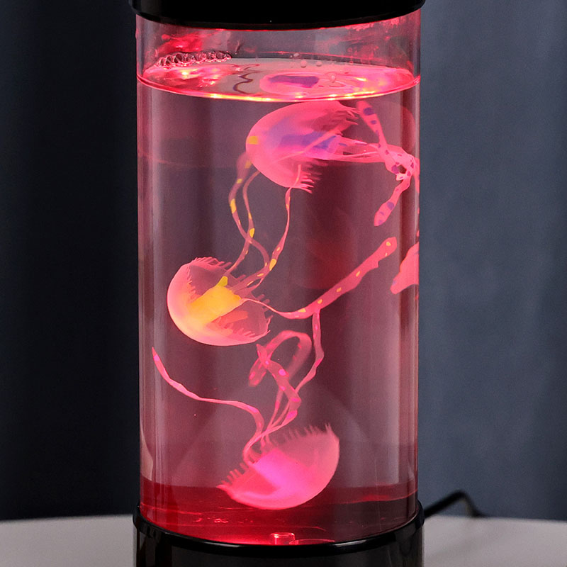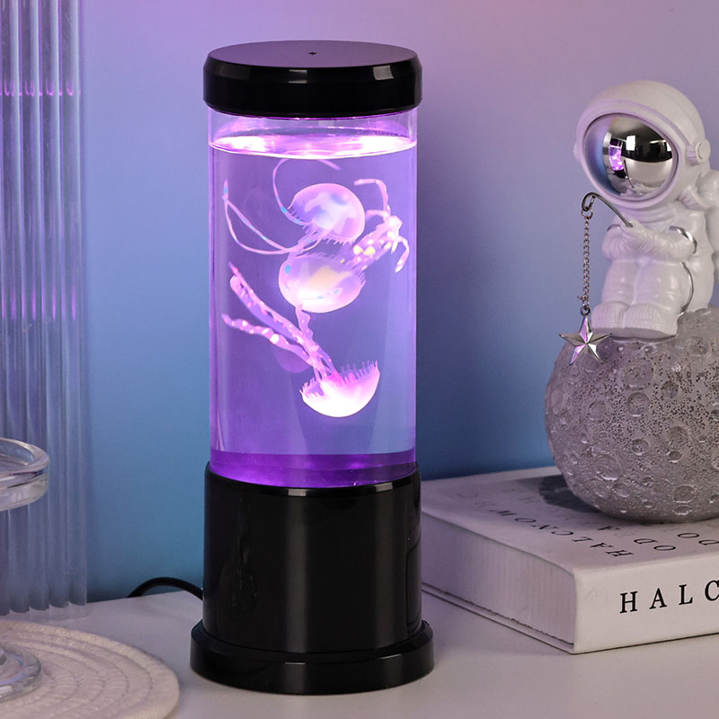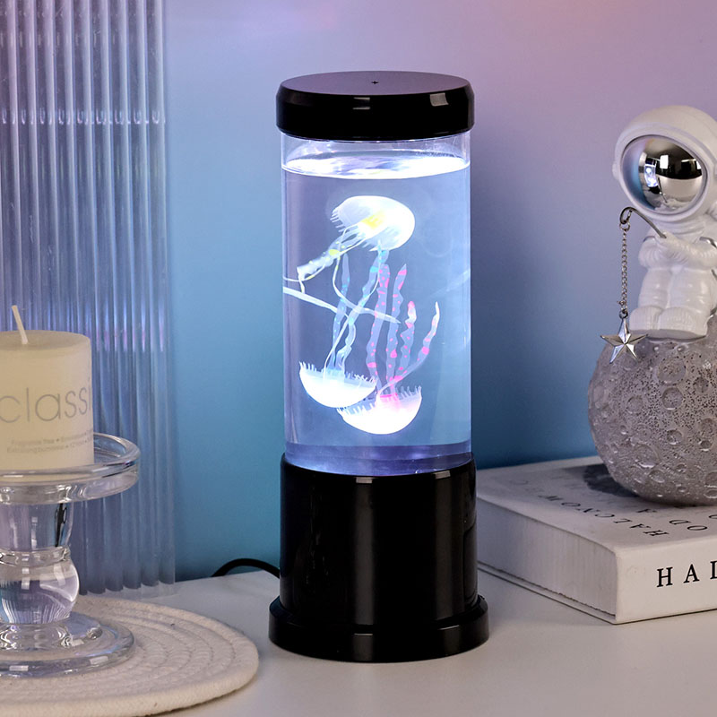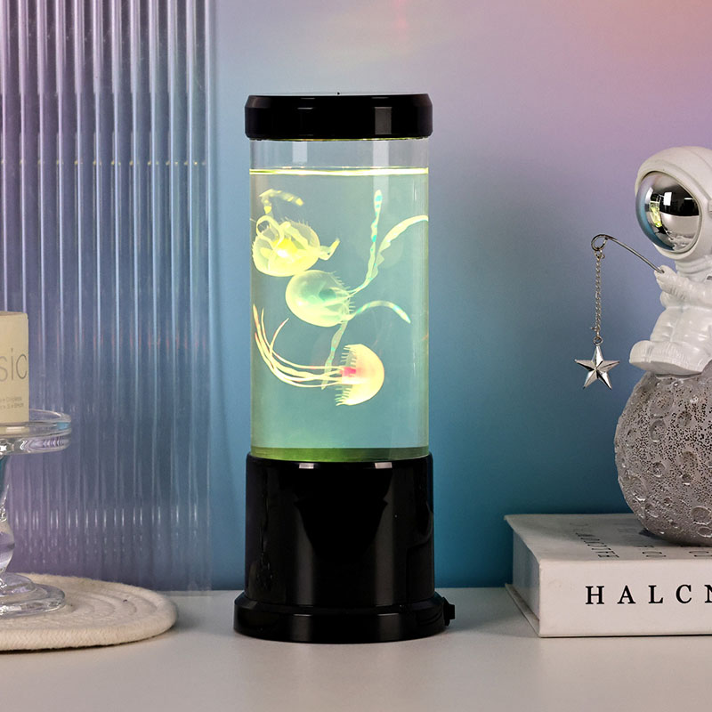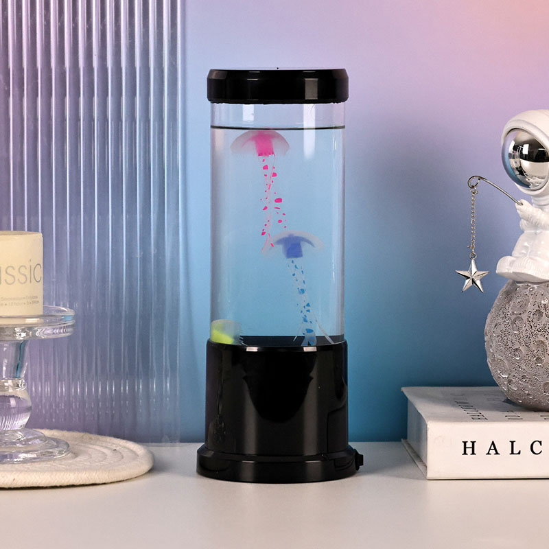 Lambil on elutruud musta varjundiga meduusid, mis hõljuvad õrnalt läbipaistvas silindrilises paagis, luues rahustava veealuse õhkkonna, mis muudab iga ruumi rahulikuks ookeaniliseks varjupaigaks.