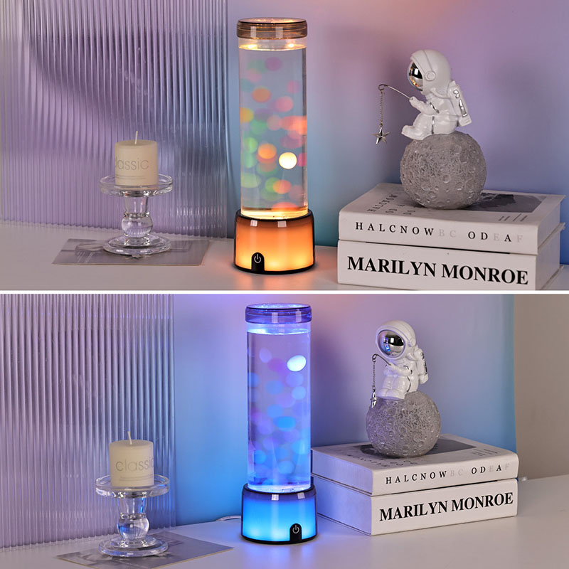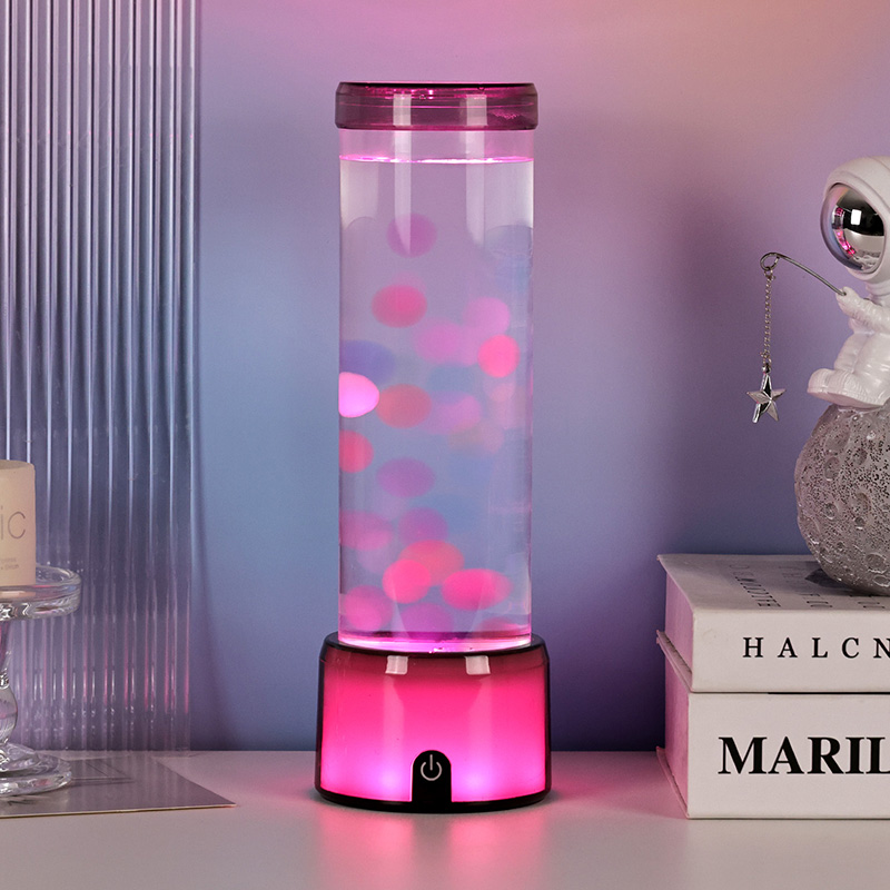 Tootekirjeldus: silindriga simuleeritud akvaariumilamp värvimuutva LED-i ja hõõguva meduusiga – kõrge, alalisvoolutoitega, nupuga juhitav dekoratiivvalgusti