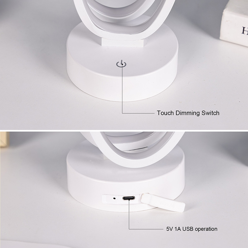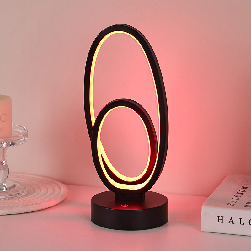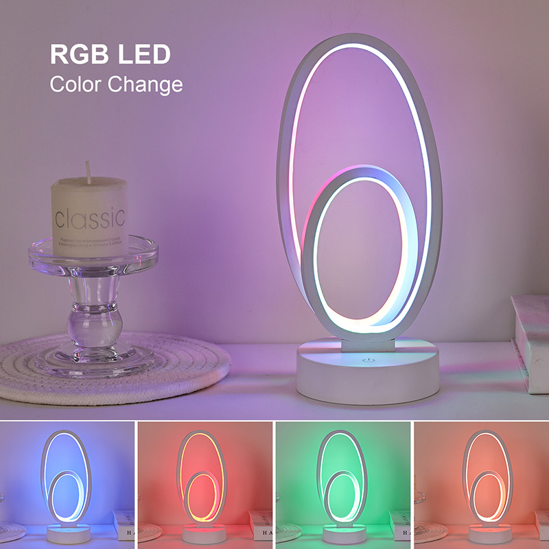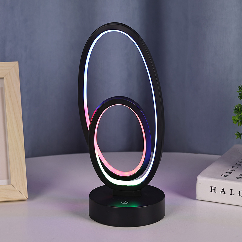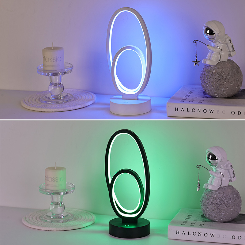 Kahe ümmarguse rõngasvarjuga RGB laualamp on koduruumide kunstiline aktsent, millel on alalisvoolu ohutu madalpinge toiteallikas, mis tagab stabiilse ja energiasäästliku jõudluse ning tagab ohutu kasutamise. Sobib erinevatele stsenaariumidele, nagu elutuba, lastetuba, õppeala ja magamistuba