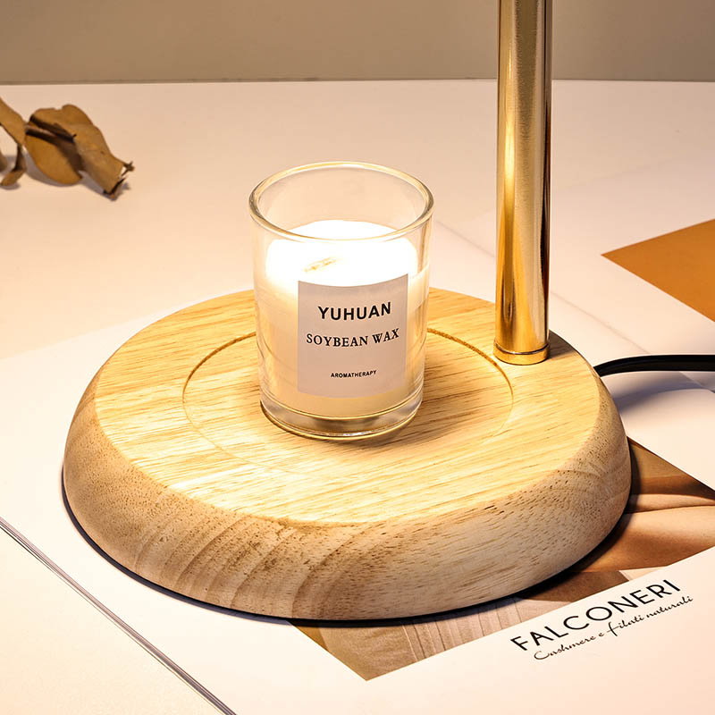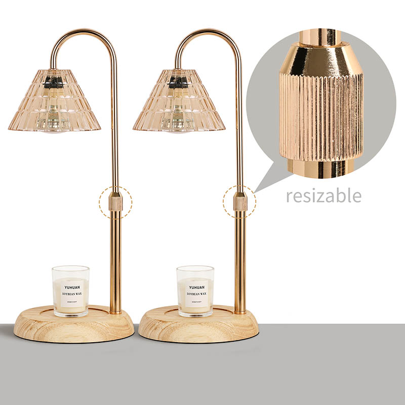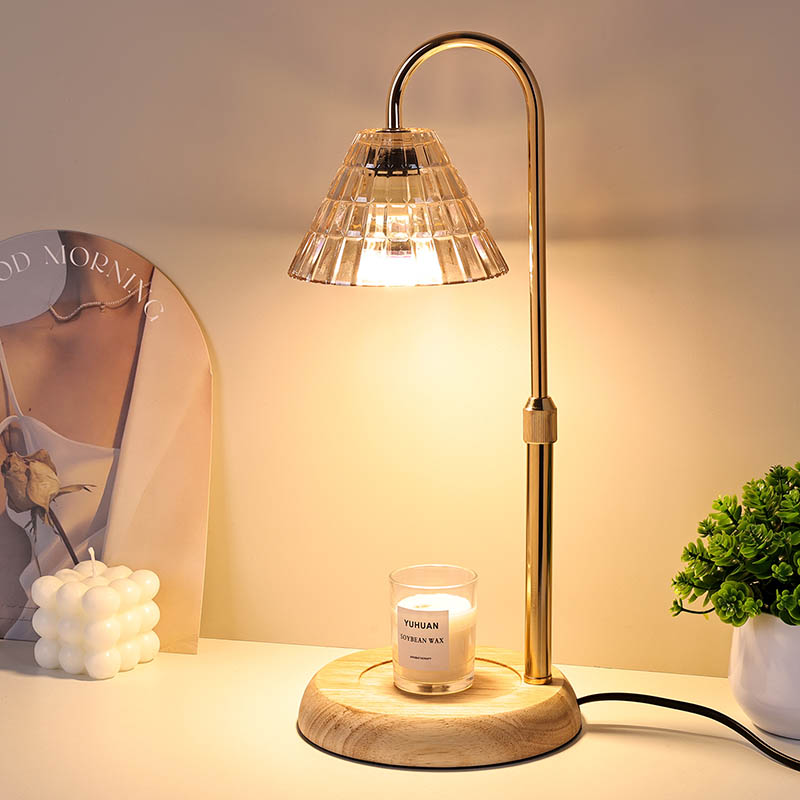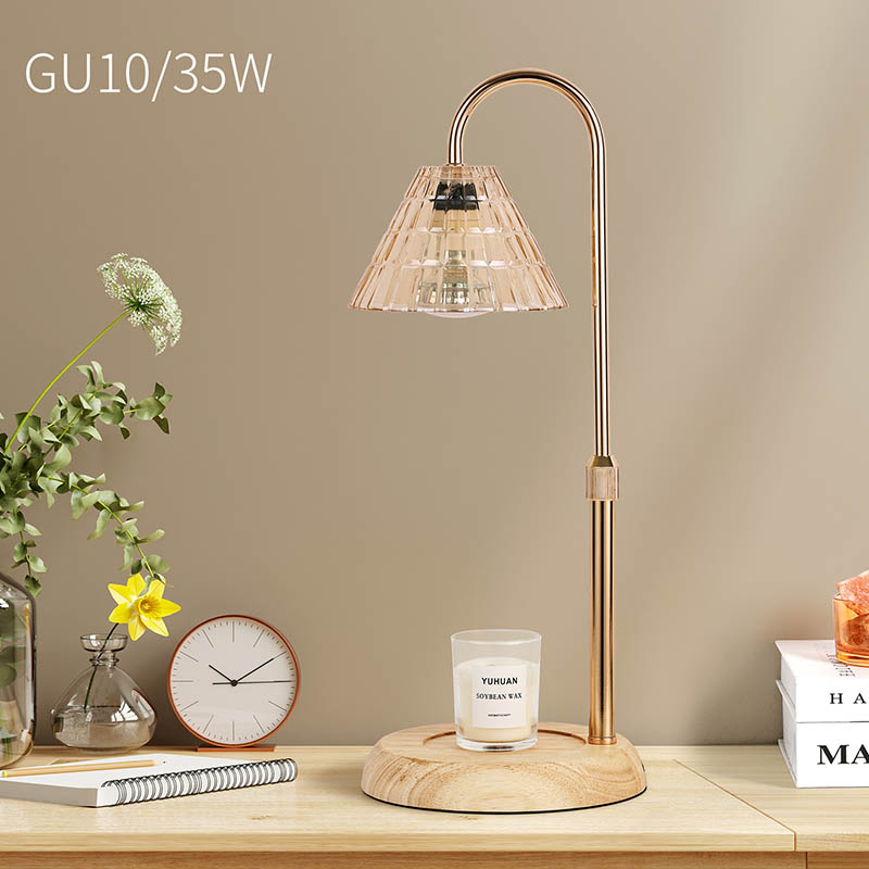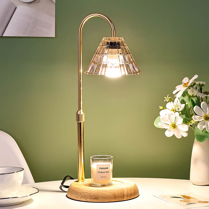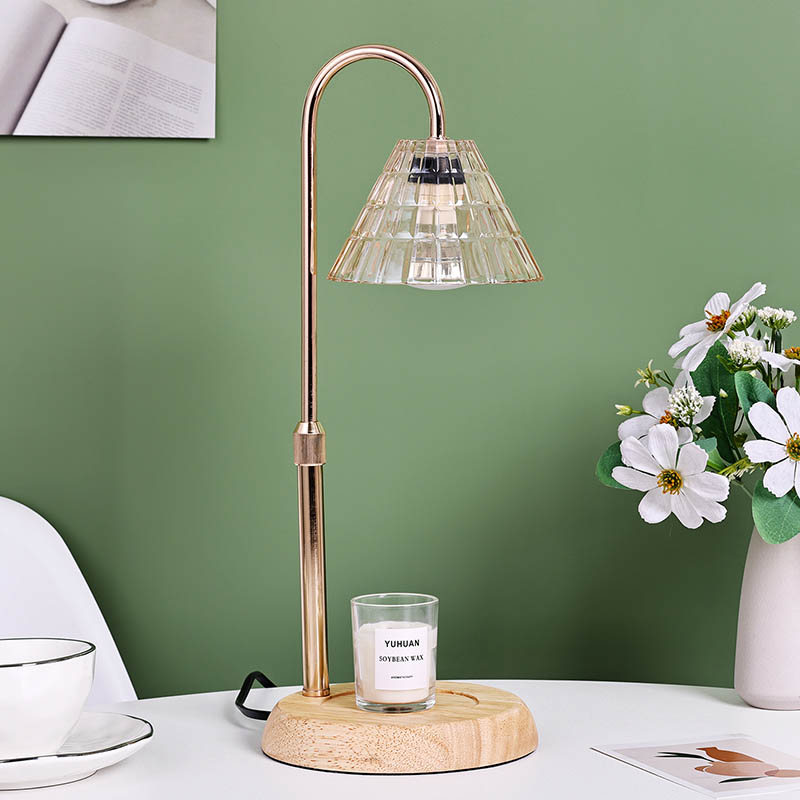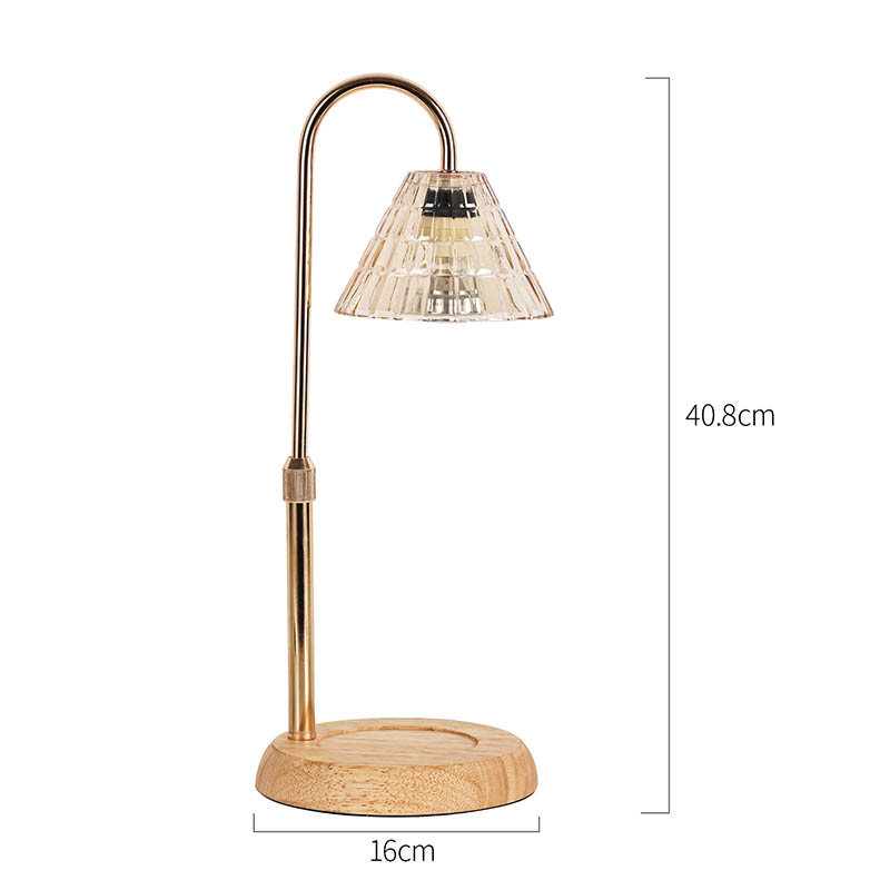 Klaasvarjuga laualamp reguleeritava kõrgusega on traditsioonilise disainistiiliga, mis koosneb traditsioonilisest puidust alusega lambipirnist ja kuldsest metallist lambipostist.
