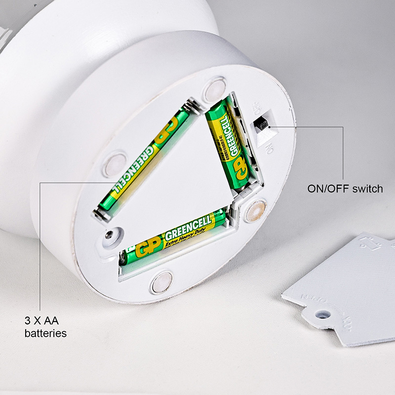 Pole vaja ühendada; seda saab toita vaid 3 AAA patareiga, mida on lihtne paigaldada ja kasutada paindlikult. Olgu see asetatud öökapile, kirjutuslauale, beebivoodile või kaasa võetud telkima