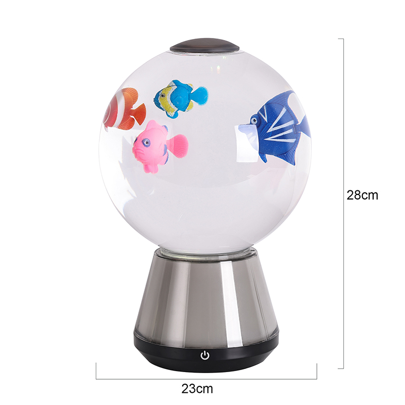 Keskosa on läbipaistev silindriline paak, mis on täidetud õrna, aeglaselt liikuva vedelikuga, mis suurendab veealuse liikumise illusiooni. Sees keerlevad keeruka disainiga miniatuursed haifiguurid, mis on kujundatud realistlike kontuuride ja peente detailidega, sujuvalt koos pehmete, voolavate meduusikujuliste elementidega, mida valgustavad sisemised LED-id. Kombineeritud liikumine loob dünaamilise, kuid rahustava visuaalse rütmi, kutsudes esile ookeanielu vaikset majesteetlikkust. Ükskõik, kas lõõgastute pärast tööd, mediteerite või aitate lapsel magama jääda, pakub see lamp rahulikku sensoorset kogemust, mis vähendab stressi ja tekitab imestust.