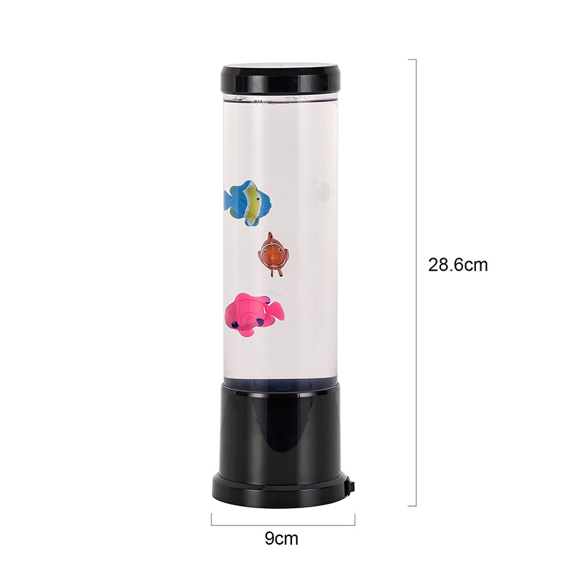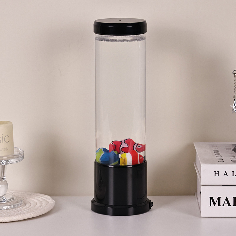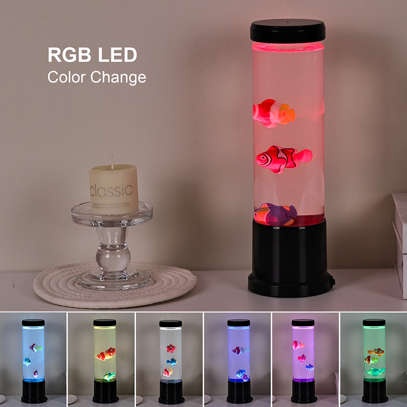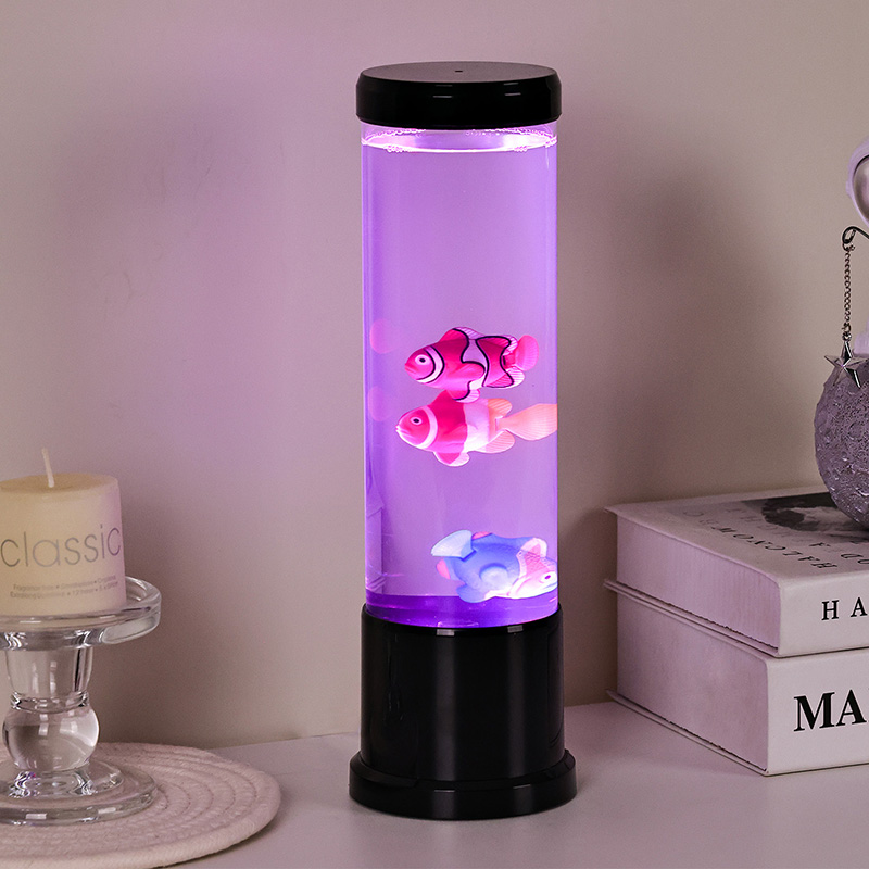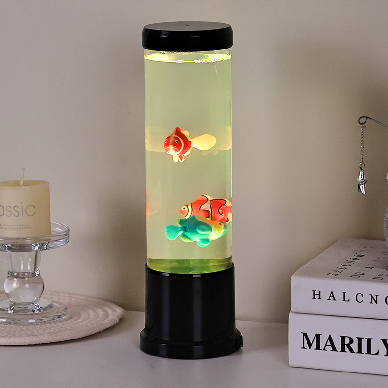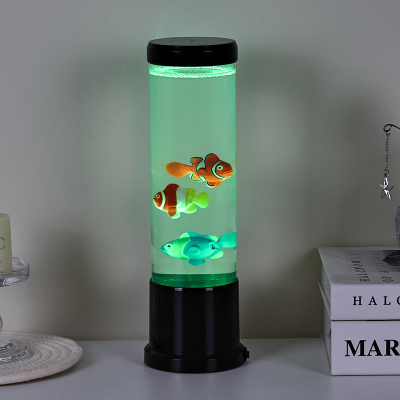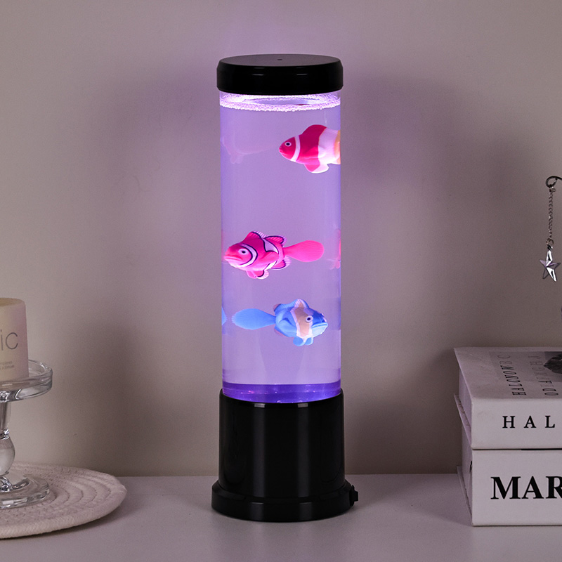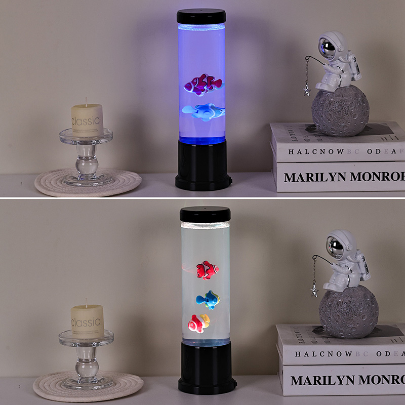 Selle lambi keskmes on hoolikalt koostatud tõelise kalapaagi simulatsioon. Läbipaistva veeru seest leiate kaunilt üksikasjalikud hõljuvad kalafiguurid – nagu elujõulised klounkalad ja muud troopilised liigid –, mis liiguvad ja ujuvad õrnalt läbi veetaolise vedeliku. Hõõguvate meduuside lisamine suurendab maagilist veealust illusiooni, pulseerides pehmelt eeterliku valgusega. Liikumise ja värvi kombinatsioon loob dünaamilise stseeni, mis köidab tähelepanu ja toob teie keskkonda rahu.