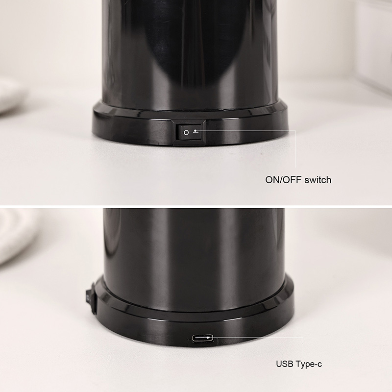 Kõrgekvaliteedilisest vastupidavast plastikust valmistatud kõrgel mustal lambil on tugev alus, mis hoiab ära ümberkukkumise ja tagab stabiilsuse laudadel, riiulitel või öökappidel. Läbipaistev kesktoru on kriimustuskindel ja kergesti puhastatav, säilitades aja jooksul selguse. Ülemine kaas on kindlalt suletud, et vältida lekkeid, samas kui sisemised komponendid on ohutuse tagamiseks täielikult suletud.
