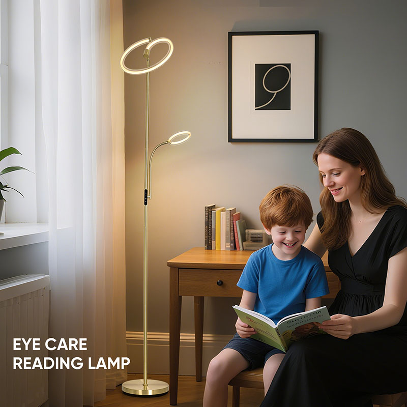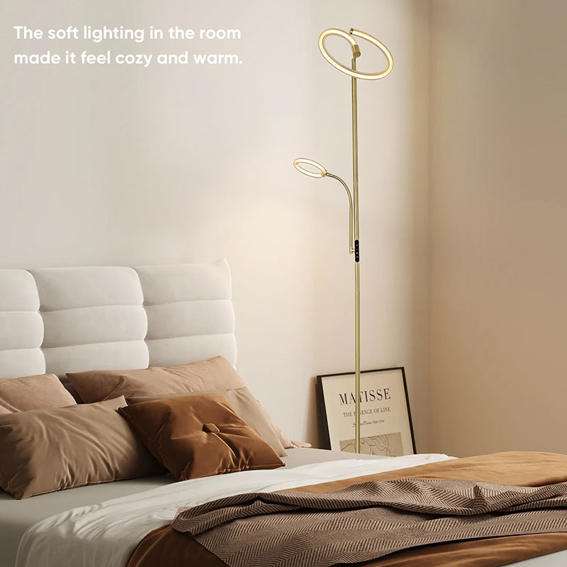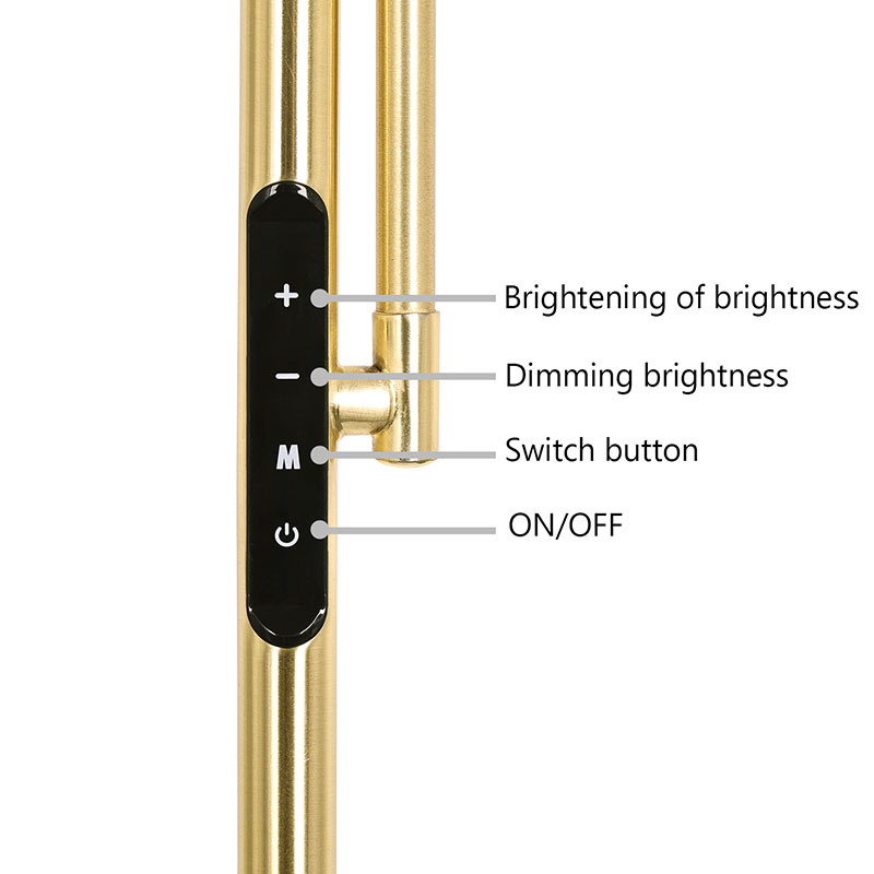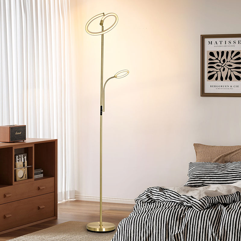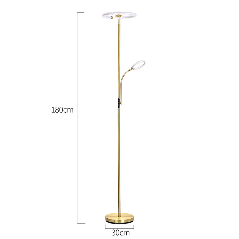 Luksuslik Gold led-põrandalamp elutuppa on valmistatud kvaliteetsest kuldsest metallmaterjalist, lihtsa, kuid luksusliku üldkujundusega. Metallmaterjal on peeneks poleeritud ja töödeldud, sileda ja õrna pinnaga ning pehme läikega, mis loob õilsa ja elegantse atmosfääri. Kas paigutada elutuppa, magamistuppa või
