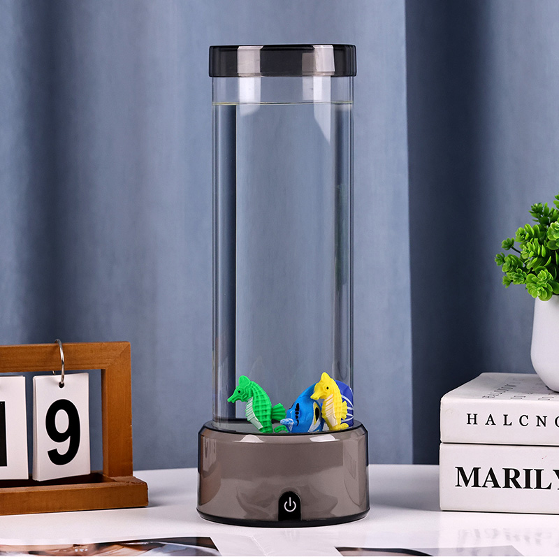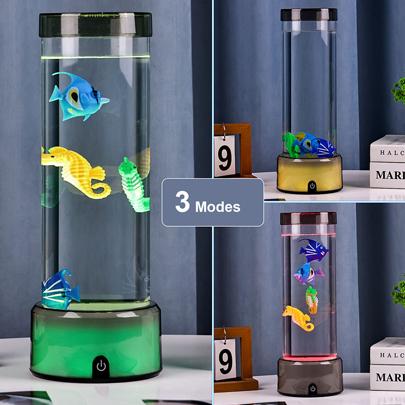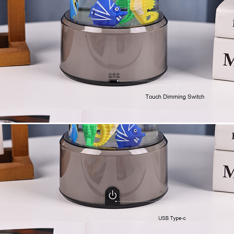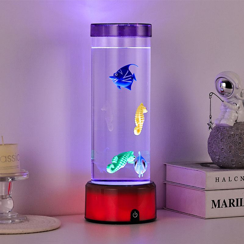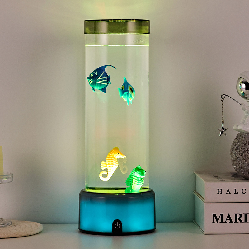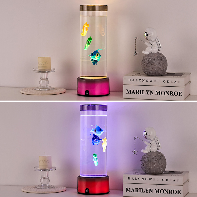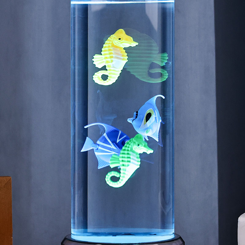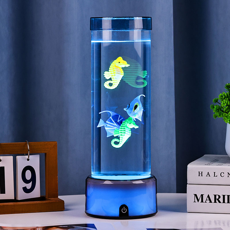võlu. Kvaliteetsest vastupidavast plastikust valmistatud kütkestav lamp on läbipaistva vedelikuga täidetud sileda silindrilise korpuse ja kaunite detailidega hõljuvate kalafiguuride, sealhulgas elavate troopiliste kalade ja võluva merihobuga, luues rahuliku, elutruu ookeanipildi, mis toob rahu ja visuaalse naudingu igasse ruumi.