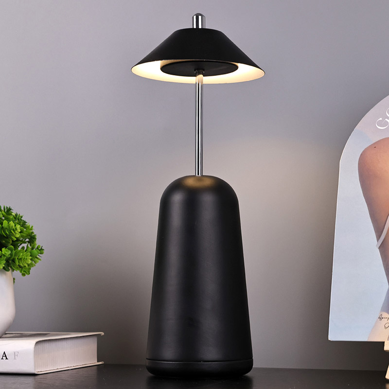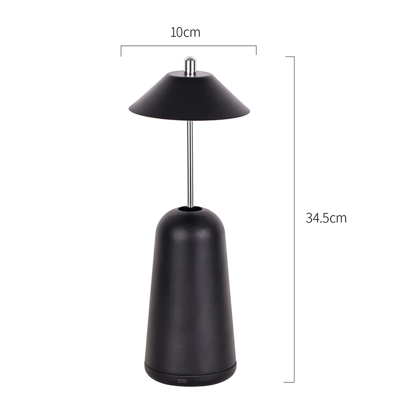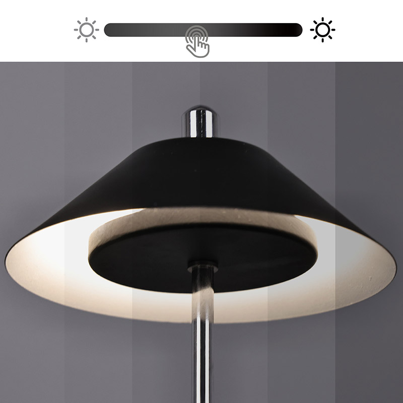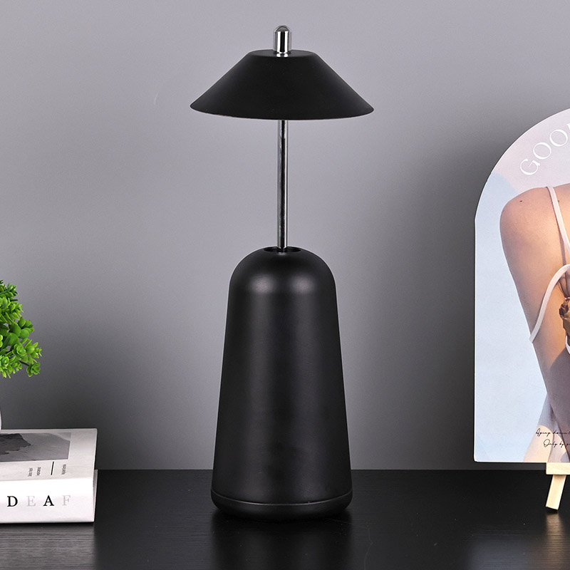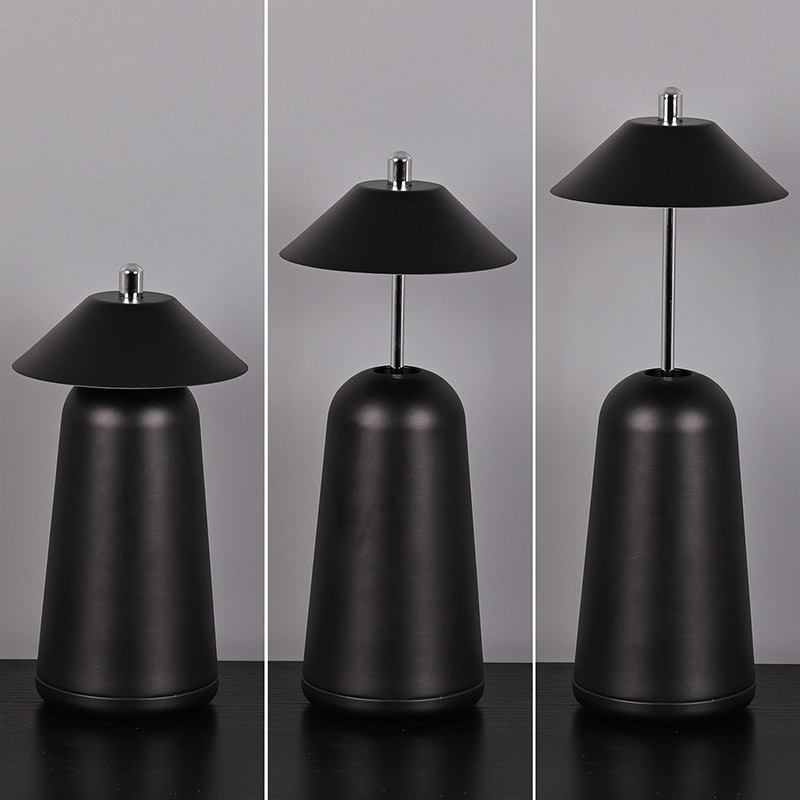 Modern Led Desk Lamp koos Adjust Hight Shade valgusega on seestpoolt lambivarju sisse lõigatud soojade värvide ja kolme valgustugevuse tasemega vahemikus 3000K kuni 6500K. Lambivarju ülaosas on puutelüliti, mis sarnaneb antenniga. Alus koosneb ebakorrapärasest silindrilisest metallist