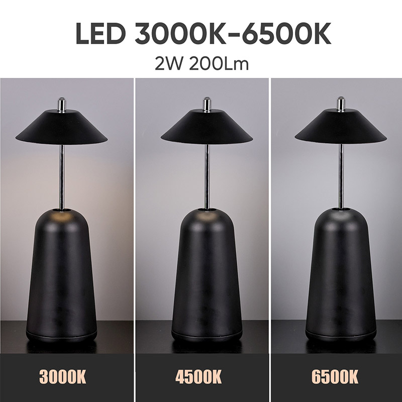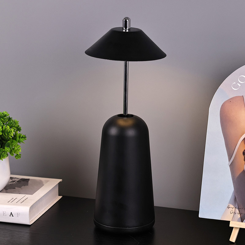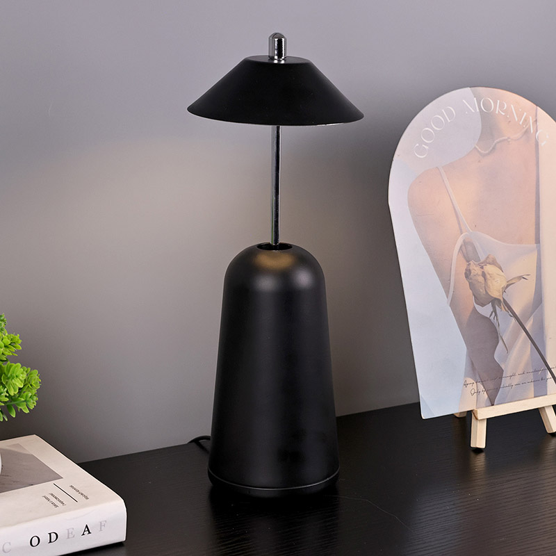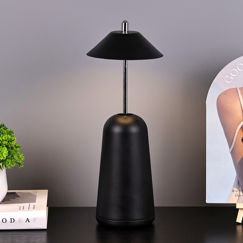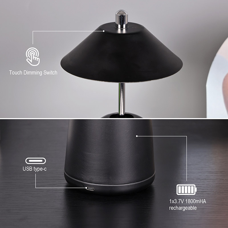 Modern Led Desk Lamp koos Adjust Hight Shade valgusega on seestpoolt lambivarju sisse lõigatud soojade värvide ja kolme valgustugevuse tasemega vahemikus 3000K kuni 6500K. Lambivarju ülaosas on puutelüliti, mis sarnaneb antenniga. Alus koosneb ebakorrapärasest silindrilisest metallist