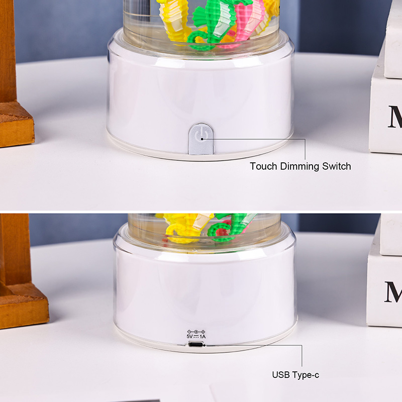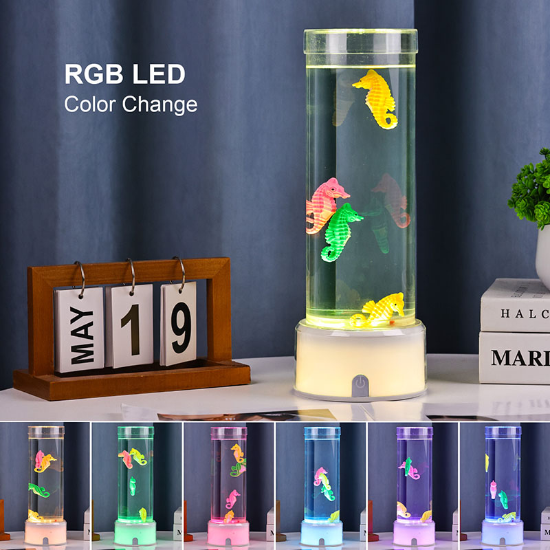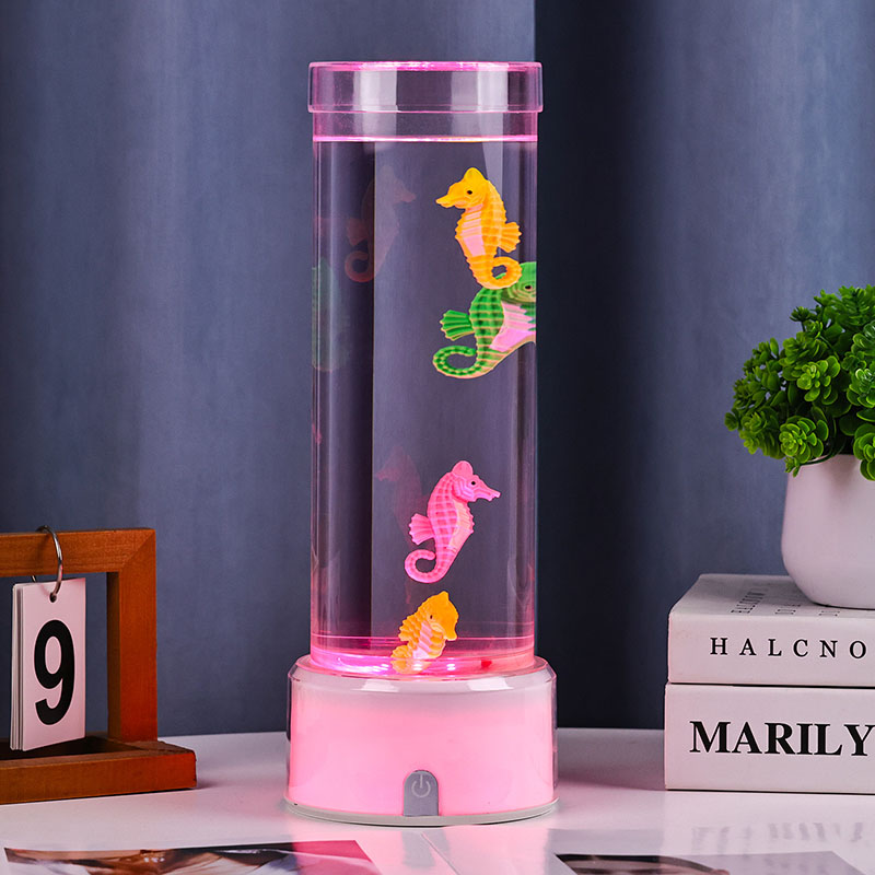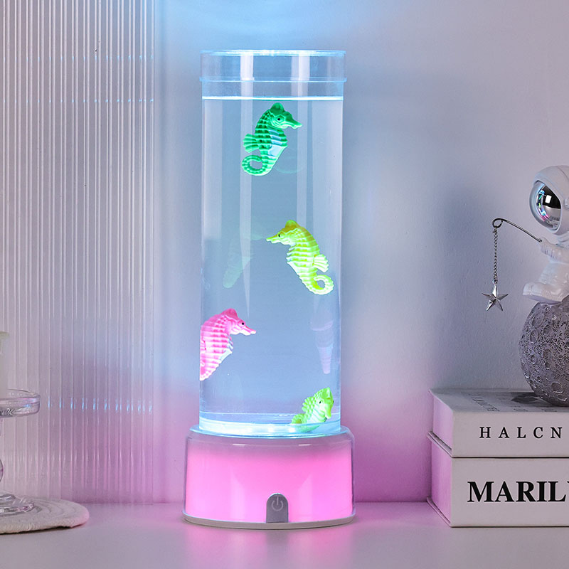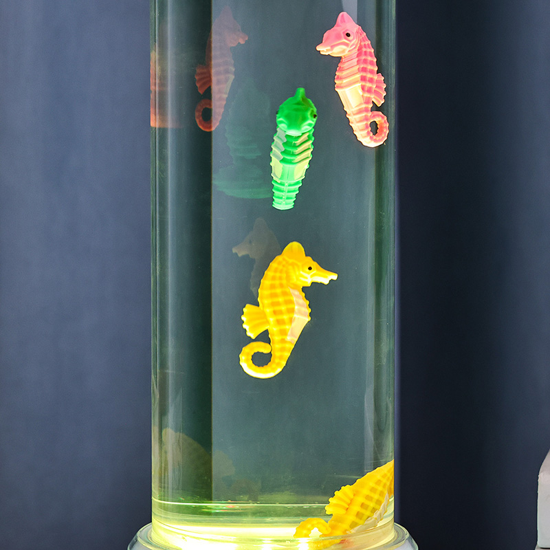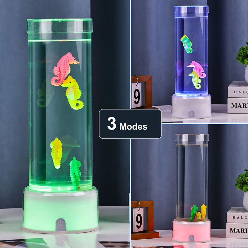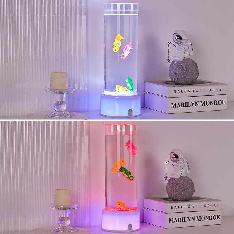 lummav veealune stseen, mis kutsub esile ookeani rahulikkust Kogu seade on valmistatud kõrgekvaliteedilisest vastupidavast plastikust, mis tagab ohutuse stabiilsuse ja kauakestva töö. Lamp on umbes 12 tolli kõrgune ning selle läbipaistev toru on täidetud mittetoksilise vedeliku ja värviliste merihobude kaunistustega. Iga merihobu on hoolikalt meisterdatud, pöörates tähelepanu detailidele, erksate värvide ja erksate tekstidega vedelik. vaikne sisemine tsirkulatsioonisüsteem, mis loob loomuliku õõtsuva liikumise, mis meenutab tõelist mereelu Seda õrna liigutust on rahustav vaadata ja see aitab vähendada stressi, pakkudes samal ajal rahustavat visuaalset kogemust